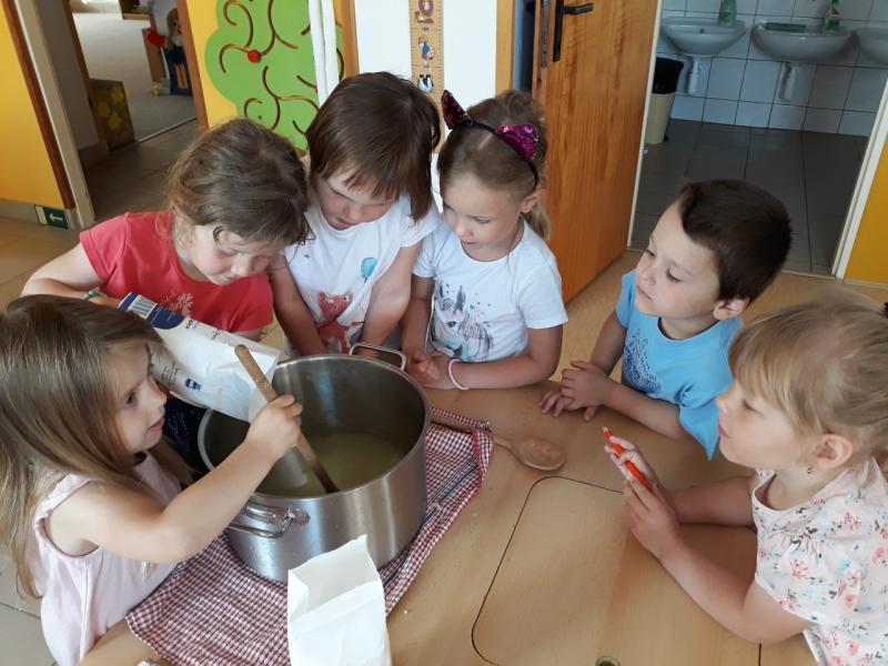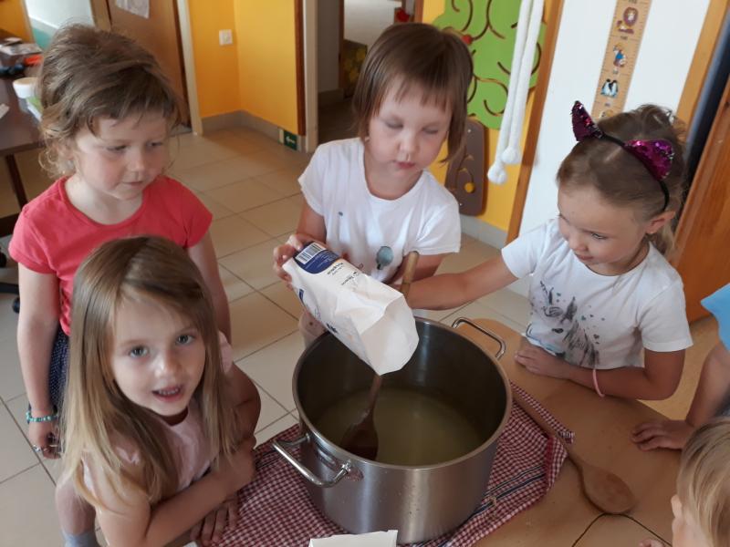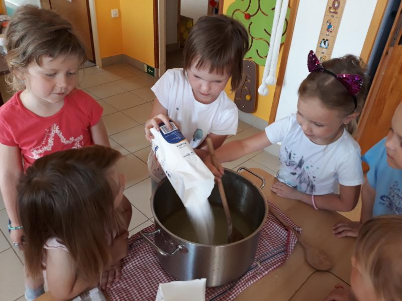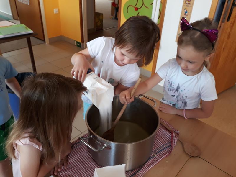 Děti tvoří bezinkovou šťávu z přírodních produktů. Mnohem víc chutná, když si ji samy vyrobily.